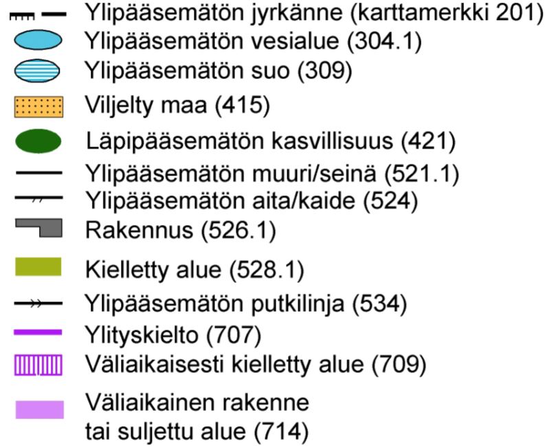 Kiellettyjen alueiden erityishuomiota. Teknisen haastavuuden lisäämiseksi kilpailualueelle on rakennettu neljä kappaletta aitoja. Karttaan nämä on merkitty ylipääsemättömän muurin merkillä. Kilpailukeskuksessa on nähtävissä malli kielletyn alueen merkintään käytetystä aidasta. Kilpailukartalla sijaitseva Flowpark seikkailurata on merkitty karttaan kielletyksi alueeksi ja aluetta reunustaa nauha kielletyn alueen merkiksi. Flowpark alueelle meno on kilpailijoilta kielletty.