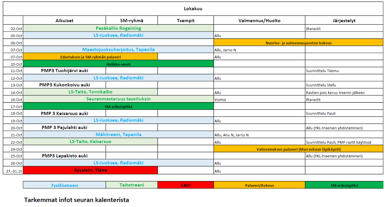 Kuukausilakana tullaan jatkossa jakamaan jatkossa valmennuksen terveisissä aina kuun alussa. Lisäksi suuripiirteisempi kausilakana kauden 2022 osalta päivittyy valmennuksen sivuille lokakuun aikana. Ajankohtaisimmat infot kannattaa tarkistaa seuran kalenterista. Ja epäselvissä tilanteissa aina kannattaa kysyä valmentajilta 🙂