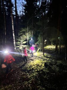 Maanantai-iltana hämärän laskeutuessa Tapanilan metsään, iso joukko suunnistuskoululaisia lähti Krissen suunnittelemalle hämäräseikkailulle. Heijastimia seuraten vastaan tuli tehtävärasteja ja viimeisellä rastilla ihan ihka elävä satuhahmo Lumikki. Aika taianomainen seikkailu!