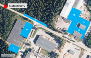 Opastus paikalle alkaa Keskikankaantien päästä eli tuttavallisemmin Pulla-Poikien risteyksestä. Iltarastikärry sijoittuu Arvi Hauvosen tielle, jonka alkupäässä on jonkin verran parkkipaikkoja. Lisäksi pysäköintiin on käytettävissä Keskikankaantie 30 (Start) ja Televisiotie 2 (Heatmasters) piha-alueet. Pysäköintiin käytettävissä olevat alueet korostettu alla olevassa kuvassa sinisellä. Ratamestari suosittelee kuitenkin lämpimästi saapumista pyörällä tai jalan. Tulee samalla tehtyä alku- ja loppuverryttelyt kuin itsestään.