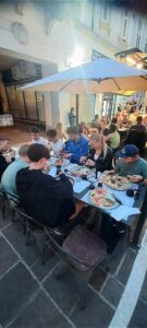 Pulahduksen jälkeen syötiin tuttua pastaa vielä viimeisen kerran. Lounaan jälkeen yhden pikkubussin verran lähti vielä suunnistamaan Slovenian vuorille. Korkeuseroja oli myös tässäkin treenissä ja maasto oli aivan upeaa hiirenkorvalla olevaa pyökkimetsää suurilla rinteillä. Muutamat, joihin leirin maastot olivat hitanneet turhan kovaa jäivät majoitukseen. Heidän tehtäväksi jäi yllätyksen järjestäminen synttärisankarille Célinelle. Kauppaan siis lähdettiin. Tavoitteena kakun ostaminen. Kakun lisäksi mukaan tarttui synttärihattuja ja kynttilät. Muiden saavuttua treenistä oli nopeat suihkut ja lähtö synttäridinnerille. Koska Italia oli aivan vieressä, olihan pitsaa päästävä syömään. Ja kyllä kannatti. Dinnerin päätteeksi ravintola yllätti synttärisankarin kakulla ja laululla. Muutama tiktokkikin tuli illan aikana kuvattua. Kämpillä edessä odotti kamojen pakkaus, mutta sitä ennen eivät synttärisankarin yllätykset loppuneet. Oli kakun ja hattujen aika. Lopuksi esitettiin vielä uusi hittibiisi Cocacoladietillä. Mainio tapa päättää kaikin puolin mahtava leiri.