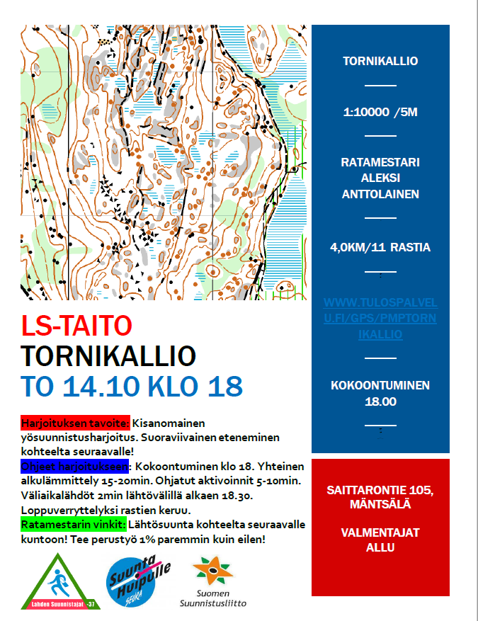 | Torstai 14.10 | Tornikallio, Saittarontie 105, Mäntsälä | Aleksi Anttolainen | ![]() | www.tulospalvelu.fi/gps/PMPTornikallio | Halikko-viesti taitoporkkana |