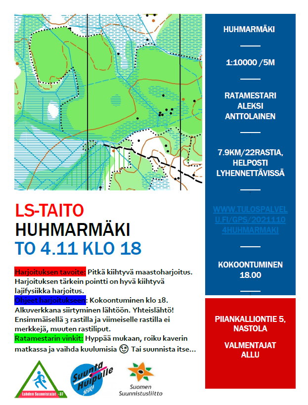 | Torstai 4.11 | Huhmarmäki, Piiankalliontie 5 | Aleksi Anttolainen | ![]() | www.tulospalvelu.fi/gps/20211104Huhmarmaki | |