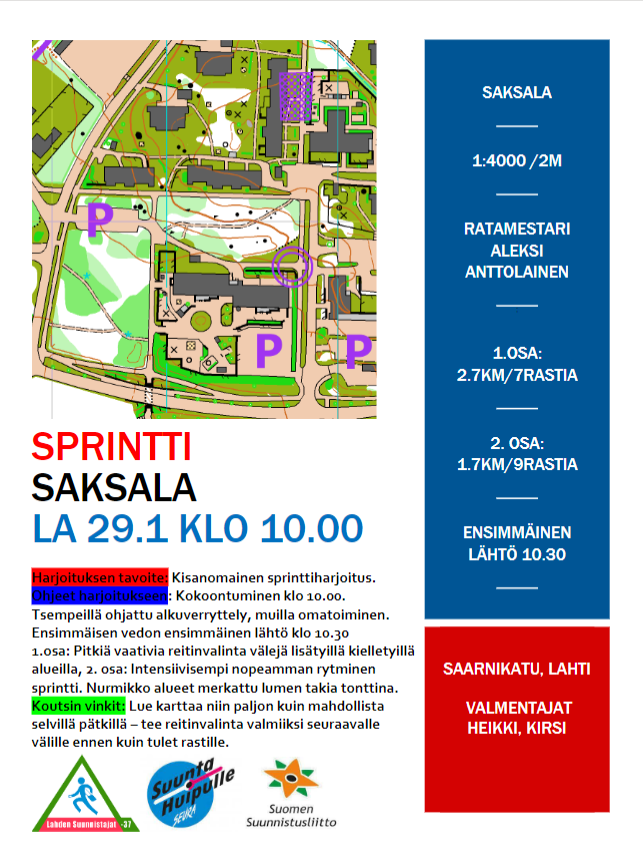 | 29. tammikuuta klo 10.00 | ![]() | Sprinttikisa | Saarnikatu, Lahti. Parkkipaikkoja Saarnikadulla ja Tammipolulla. | Allu |