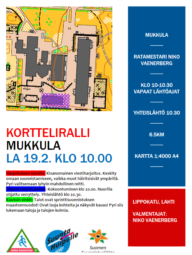 | 17. helmikuuta klo 18.00 | ![]() | Sprinttivedot | Länsiharjun koulu, Helsingintie 52, Lahti | Allu |